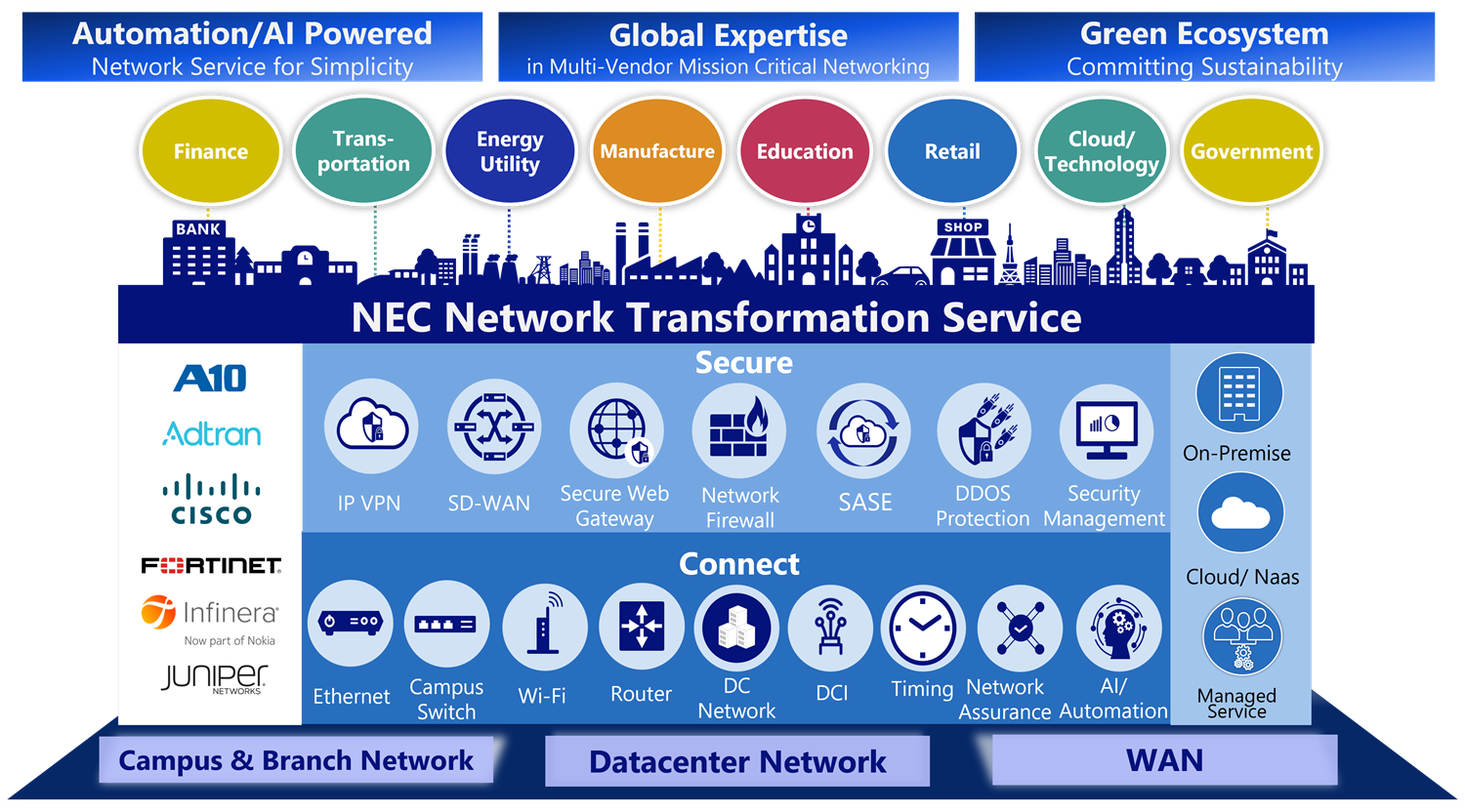 Com experiência global em setores como data centers, finanças, energia e utilities, a NEC oferece soluções de rede eficientes, inteligentes e sustentáveis, impulsionadas por IA. Também apoiamos empresas na definição de estratégias eficazes de rede em nuvem, seja híbrida ou privada, permitindo a execução de cargas de trabalho de IA com alto desempenho, segurança e otimização do Custo Total de Propriedade (TCO).