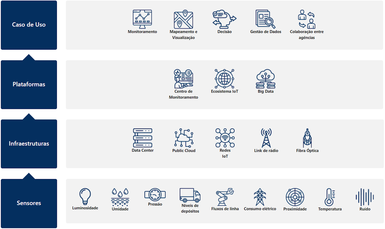 Uma cidade inteligente pode ser identificada através de seu transporte, energia, educação e saúde, também no tratamento de lixo, sua vigilância e economia, e no desenvolvimento e uso de tecnologias. Dentro desse ecossistema convivem diferentes atores, como os do setor privado, os da administração e consultoria, líderes das estatais de telecomunicações e infraestrutura, e também provedores logísticos de apoio à gestão.